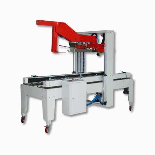 Các chân máy trang bị bánh xe giúp thuận tiện di chuyển, và phần thân máy chứa hệ thống băng tải con lăn để dịch chuyển thùng carton ra vào hệ thống dán thuận tiện hơn.
