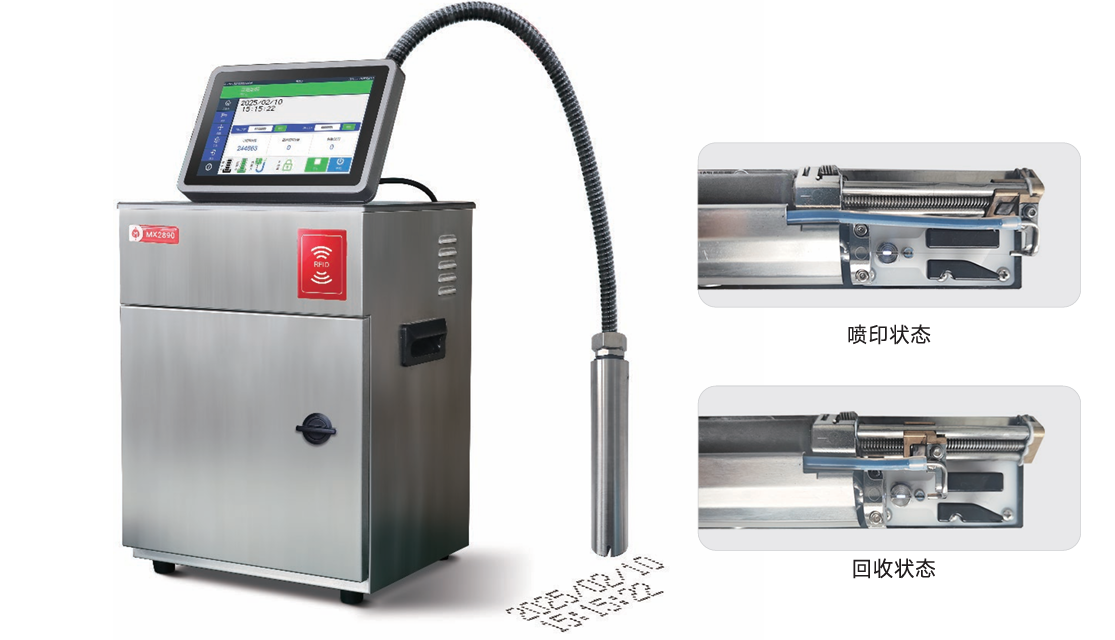 Máy in phun CIJ in phun liên tục MX 2890 thế hệ mới cho phép in phun lên đến 5 dòng in.Ngoài ra với thiết kế mới cho phép ” Hệ thống thu hồi tự động đóng mở tự động” Giúp giảm thiểu rủi ro máy in Nghẹt tia mực,Lệch tia Sau khi dừng máy khảng thời gian dài.